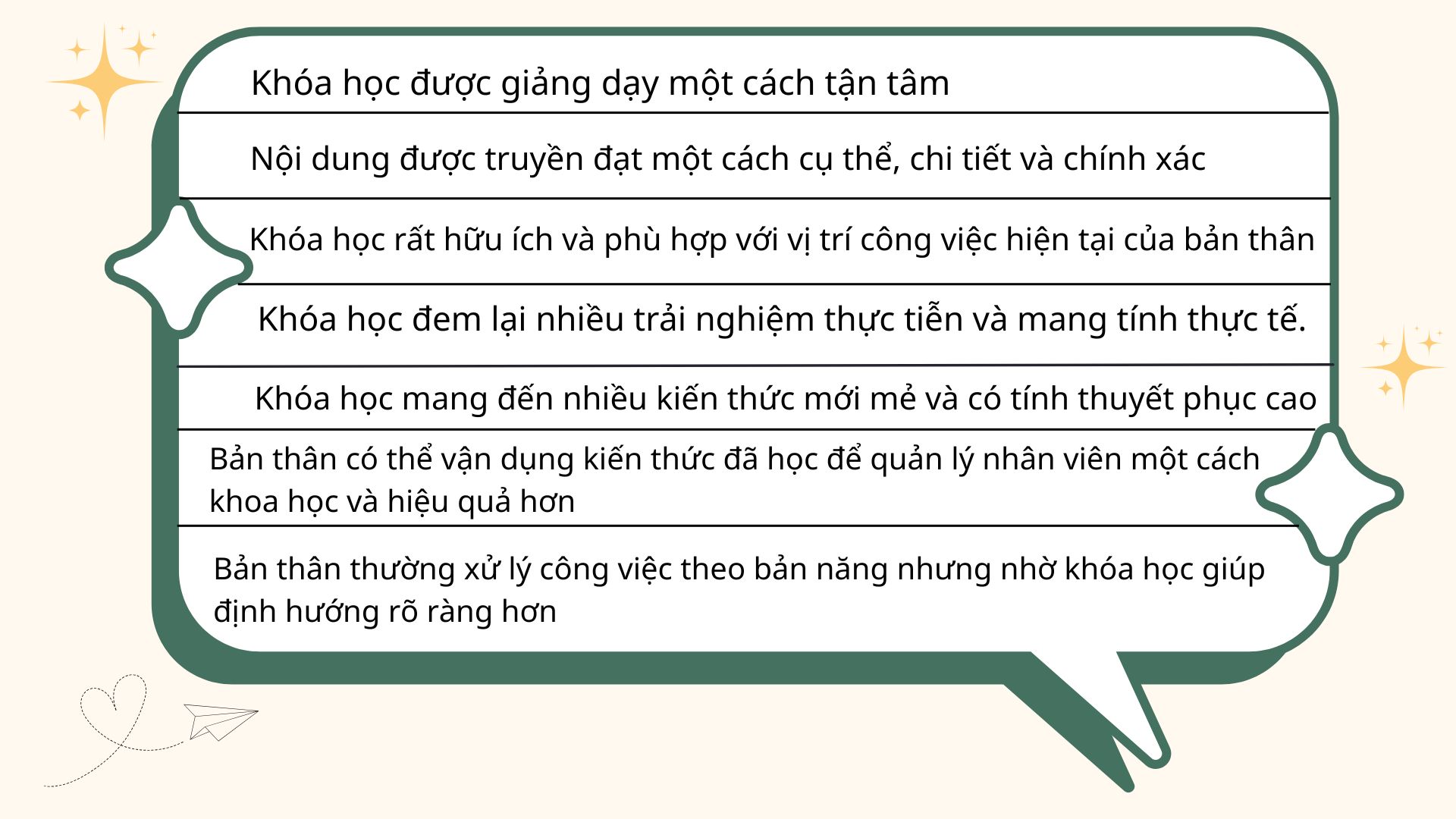 Không chỉ dừng lại ở những con số ấn tượng, giá trị thực sự của chương trình còn được kể lại qua chính những dòng cảm nhận chân thành từ học viên, những người đã trực tiếp trải nghiệm và cảm nhận sự thay đổi rõ rệt trong tư duy lẫn cách vận hành của bản thân sau khóa học: