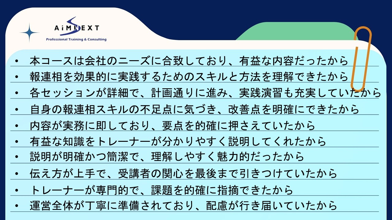 本コースは、受講者に報連相(報告・連絡・相談)の基礎力を身につけてもらい、日本企業におけるコミュニケーションと業務連携の向上を目的として設計されたから。プログラムは主に三つの重点項目で構成されていたから。