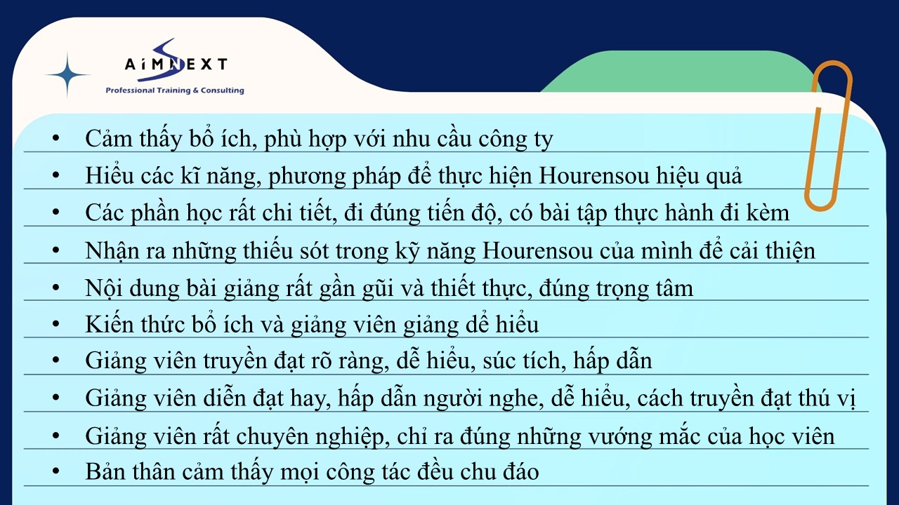 - Hiểu tầm quan trọng, cách thực hiện và ứng dụng Hou-ren-sou vào thực tế công việc.
