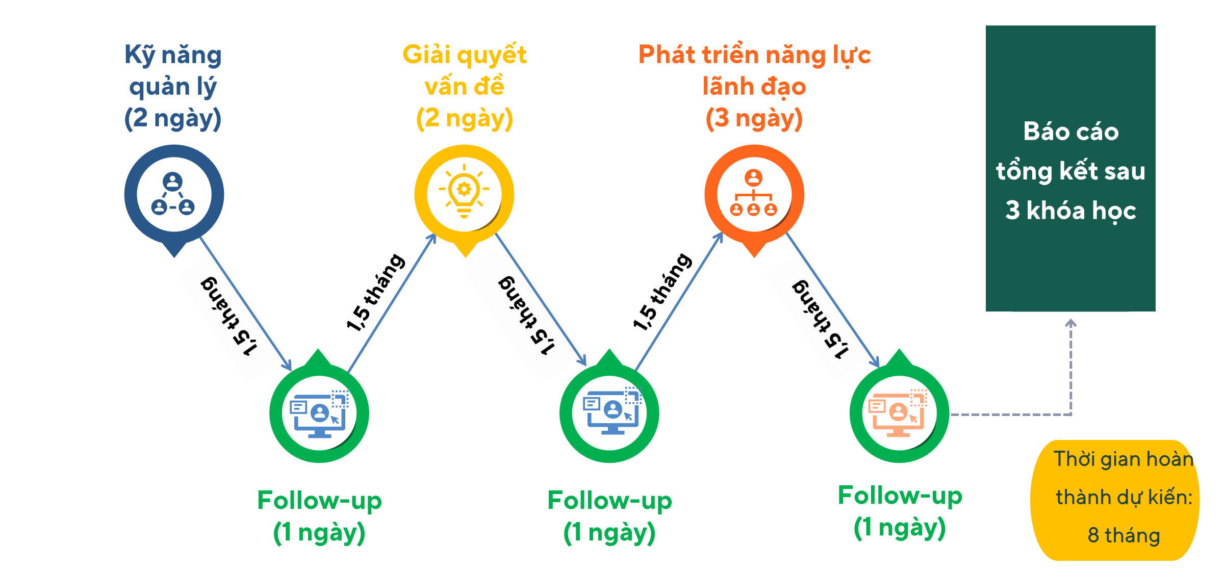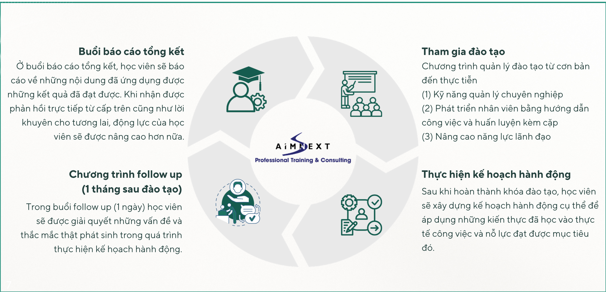Sau khi hoàn thành toàn bộ các chương trình đào tạo, các học viên sẽ tham dự buổi báo cáo tổng kết để nhận phản hồi từ giám đốc và cấp trên, từ đó nâng cao động lực học tập của học viên. Qua các chương trình đào tạo này, mục tiêu hướng tới việc nâng cao kỹ năng quản lý một cách toàn diện để đóng góp vào thành công chung của tổ chức.