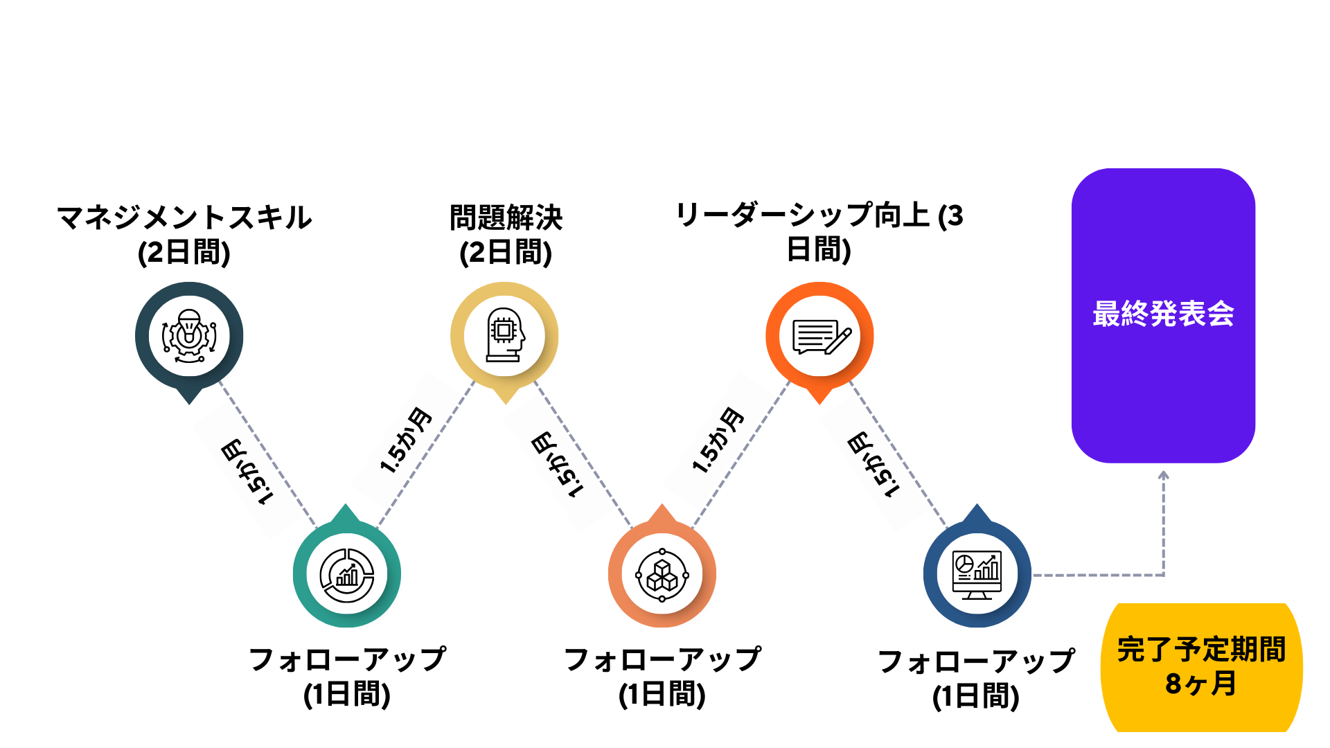 各コース終了後、受講者はフォローアップ研修に参加し、実施したアクションプラン、直面した困難、実践から得た教訓を共有します。これは、プログラムが単なる「理解」で終わらず、実際の「行動」に転換され、日常業務において明確な成果をもたらすための重要なポイントです。